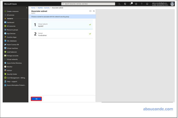 Under Associate subnet, select Virtual network and then select MyVNET. Select Subnet, select FrontEndVnet, and then select OK.