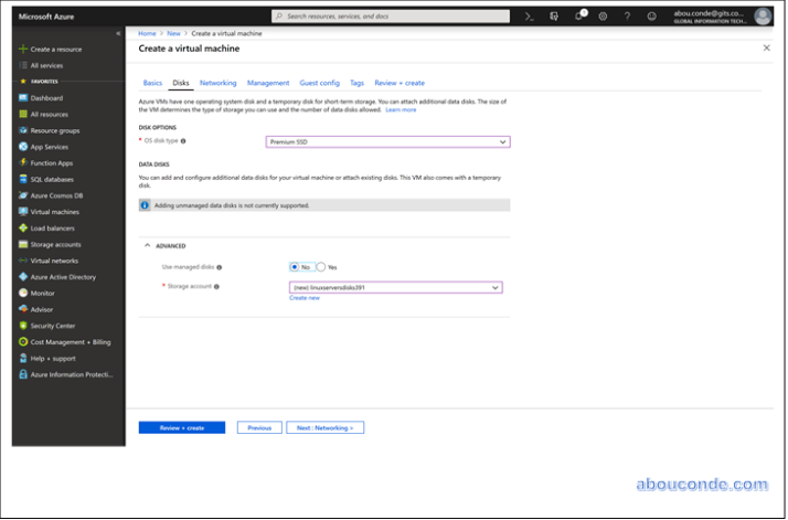 In the Disk tab, under Disk Options, choose Premium SSD and No for managed disks