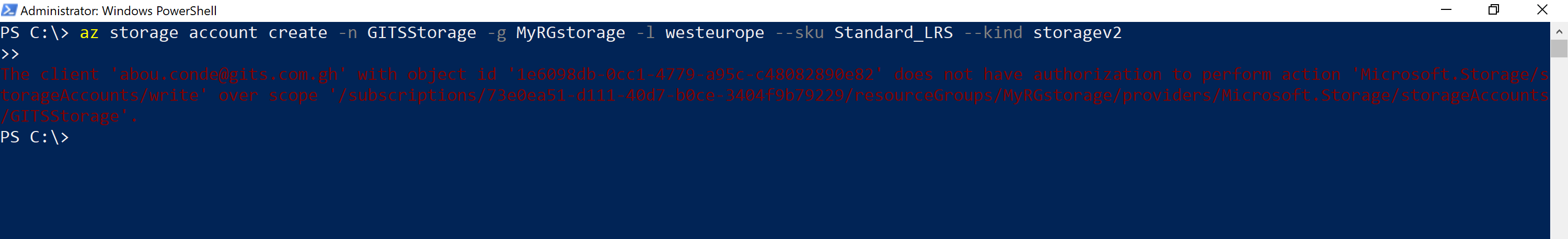 You does not have authorization to perform action. ‘Microsoft.Storage/register/action’ over scope.
