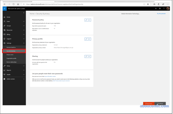 From the Microsoft 365 admin center, choose Settings, and then choose Security & privacy.
