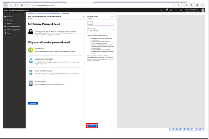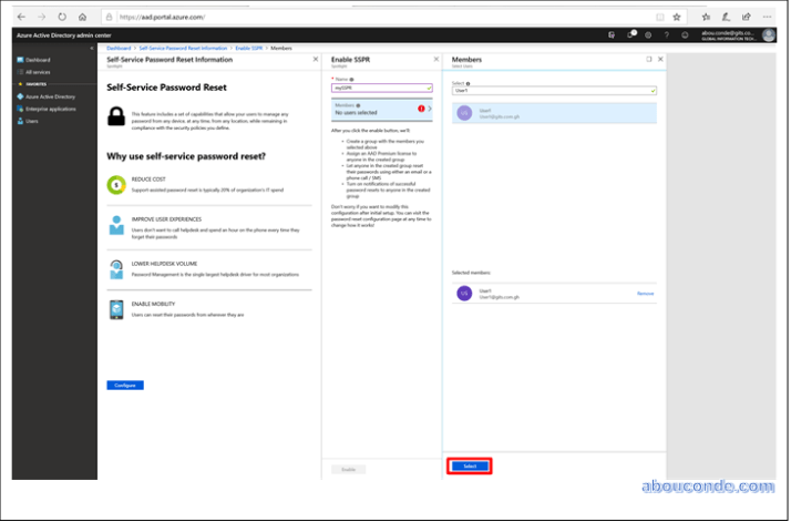 On Self-Service Password Reset Information page, enter name and Select User or Group.