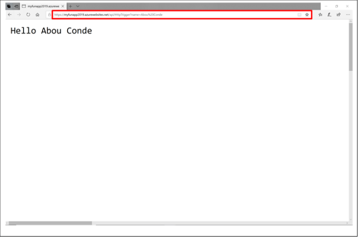 Paste this new URL for the HTTP request into your browser’s address bar. The following shows the response in the browser to the remote GET request returned by the function:
