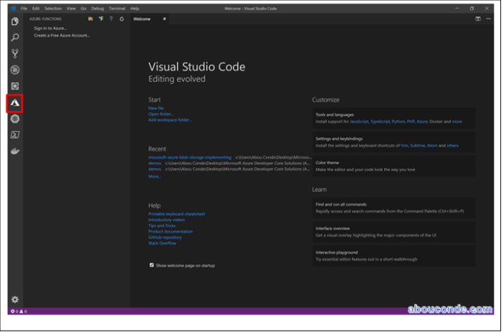 Restart Visual Studio Code and select the Azure icon on the Activity bar. You should see an Azure Functions area in the Side Bar.