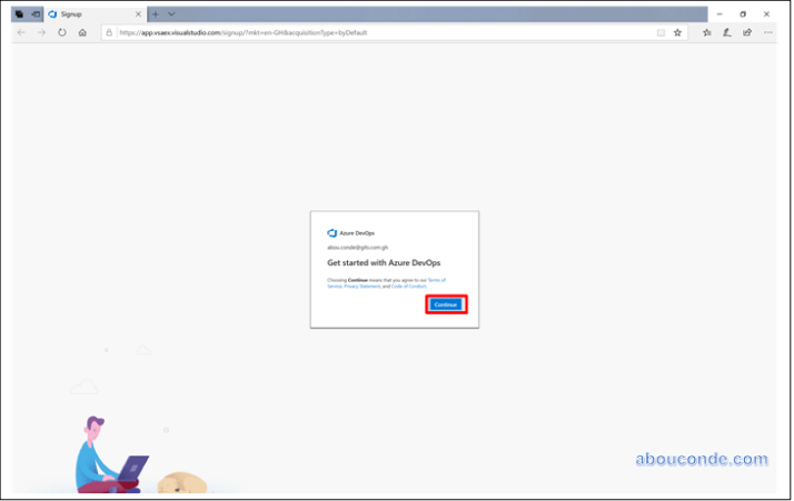 Click Continue to accept the Terms of Service, Privacy Statement, and Code of Conduct.