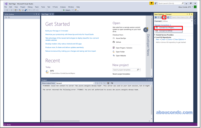 In Team Explorer, open up the Connect page by selecting the Connect icon, and then choose Manage Connections, Connect to Project.
