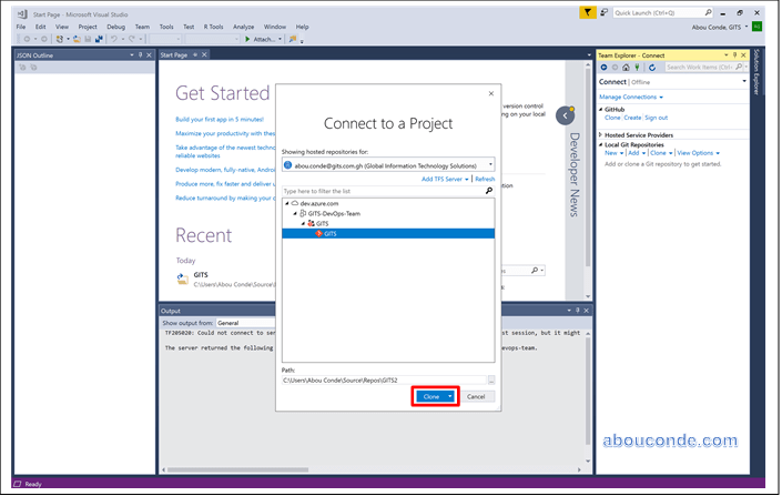 On the Connect to a Project dialog, select the repo you want to clone from the list and select Clone.