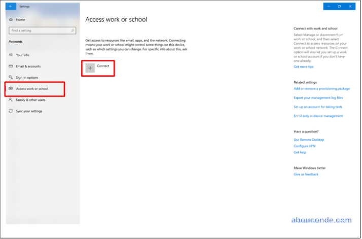Select Access work or school, and then select Connect from the Access work or school screen.