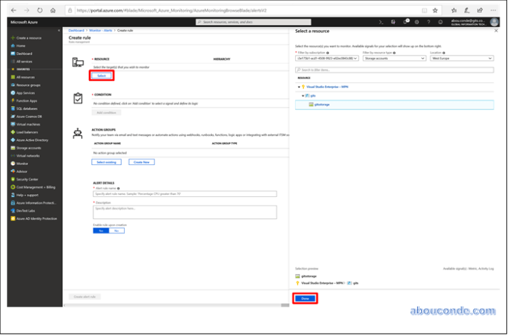 Click Select, in the context pane that loads, select a target resource that you want to alert on. My target resource is Storage account.