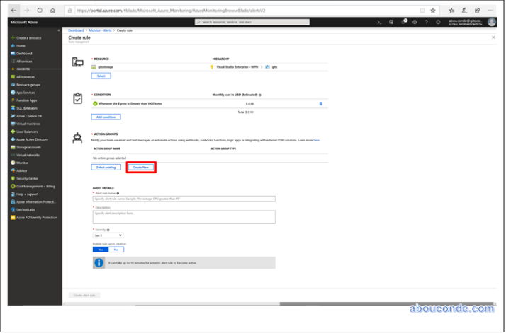 Add an action group to the alert either by selecting an existing action group or creating a new action group.