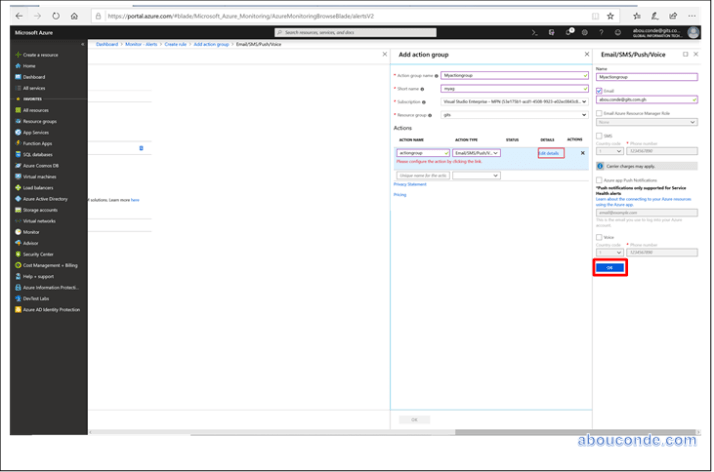 b. Action Type: Select Email/SMS/Push/Voice, Logic App, Webhook, ITSM, or Automation Runbook.