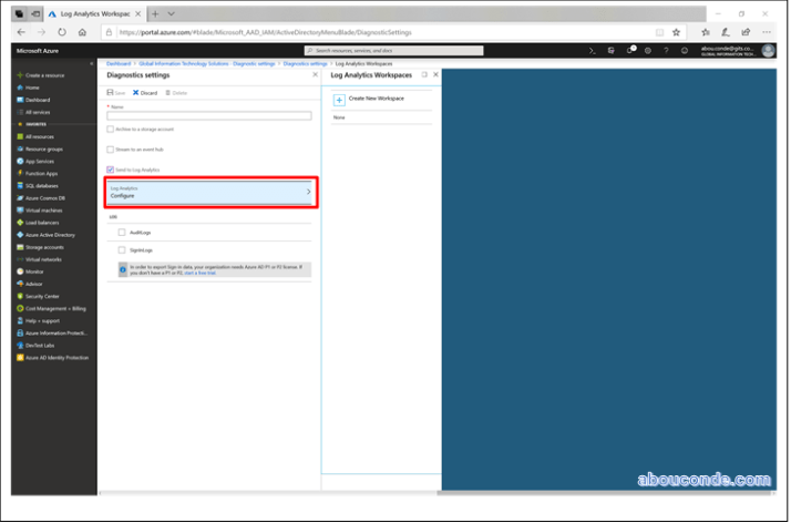 In the Diagnostic settings menu, select the Send to Log Analytics workspace check box, and then select Configure.