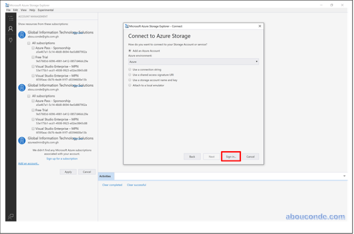 The left pane now displays all the Azure accounts you’ve signed in to. To connect to another account, select Add an account