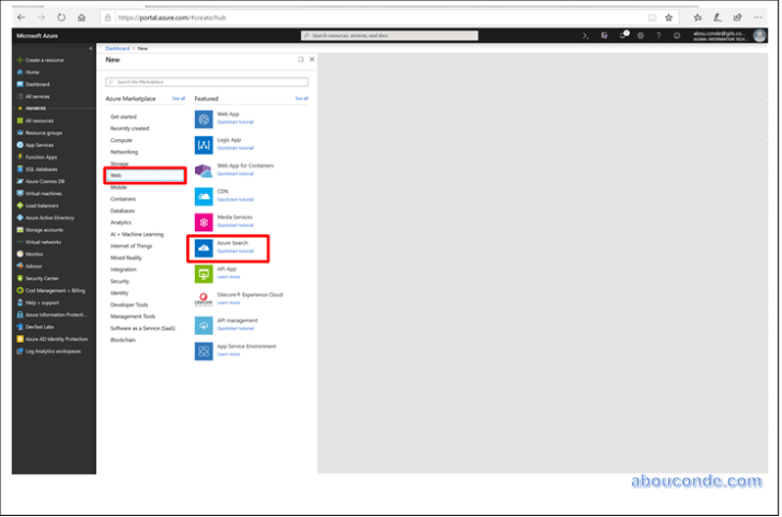 Use the search bar to find “Azure Search” or navigate to the resource through Web > Azure Search.
