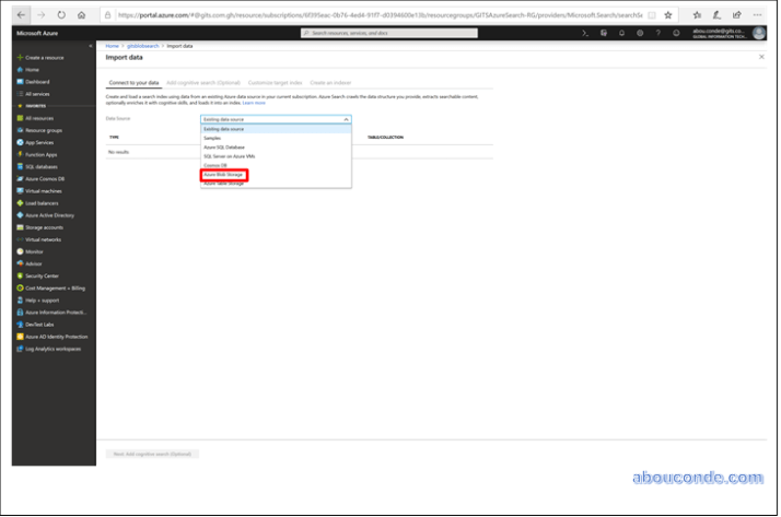 Next is Add cognitive search, in case you want to include optical character recognition (OCR) of text in image files, or text analysis over unstructured data. AI algorithms from Cognitive Services are pulled in for this task.