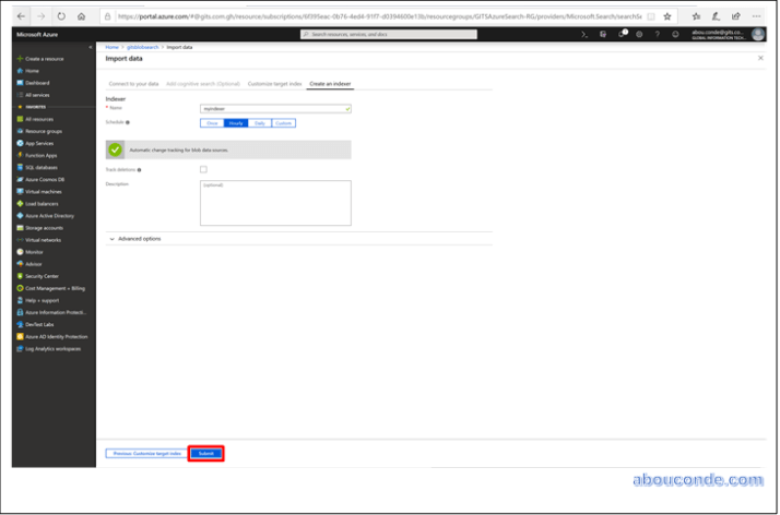 Next is Create an indexer, which is a product of this wizard. An indexer is a crawler that extracts searchable data and metadata from an external Azure data source. By selecting the data source and attaching skillsets (optional) and an index, you’ve been configuring an indexer as you move through each step of the wizard.