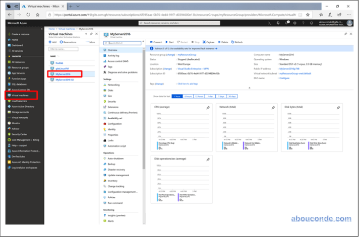 Sign in to the Azure portal and in the left pane, click Virtual machines. From the list of virtual machines, select the virtual machine to open that virtual machine’s dashboard.