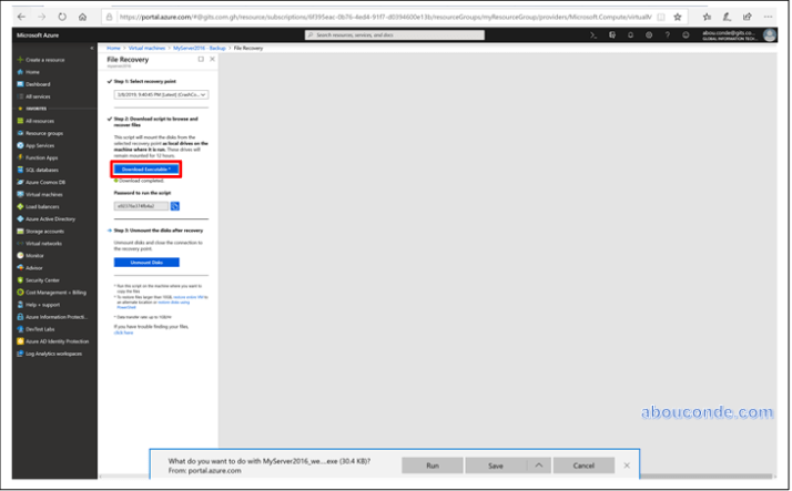 To download the software used to copy files from the recovery point, click Download Executable (for Windows Azure VM) or Download Script (for Linux Azure VM, a python script is generated).