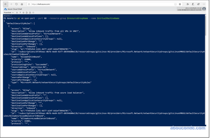 az vm open-port –port 80 –resource-group $resourceGroupName –name $virtualMachineName