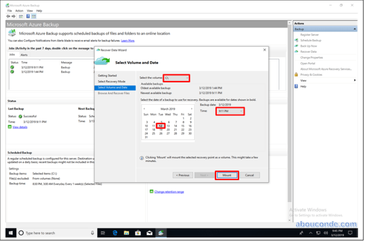 After choosing the recovery point to restore, select Mount.