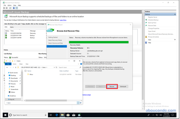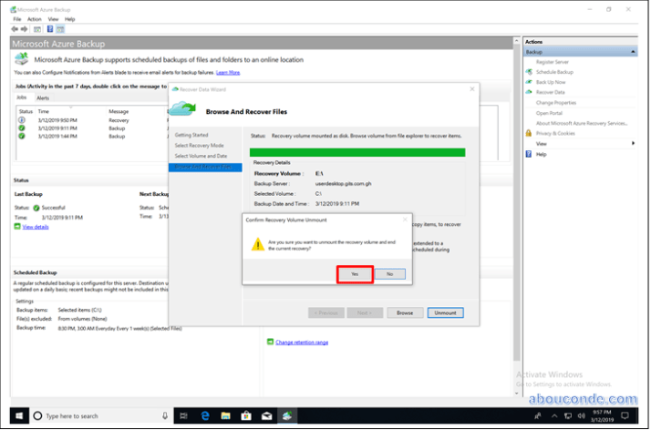 Azure Backup mounts the local recovery point, and uses it as a recovery volume.