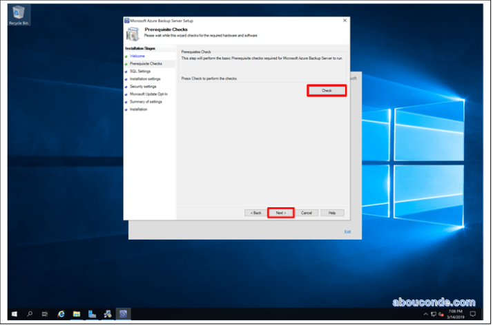 On this screen, click Check to determine if the hardware and software prerequisites for Azure Backup Server have been met. If all prerequisites are met successfully, you will see a message indicating that the machine meets the requirements. Click on the Next button.