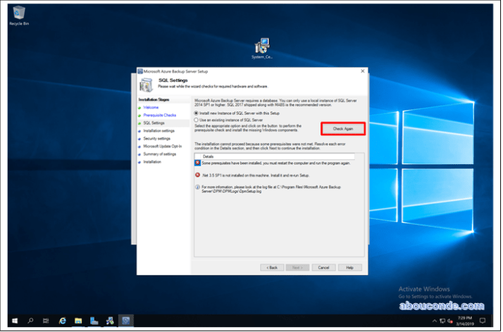 If a failure occurs with a recommendation to restart the machine, do so and click Check Again. In case of any SQL configuration issues, reconfigure SQL as per the SQL guidelines and retry to install/upgrade MABS using the existing instance of SQL.