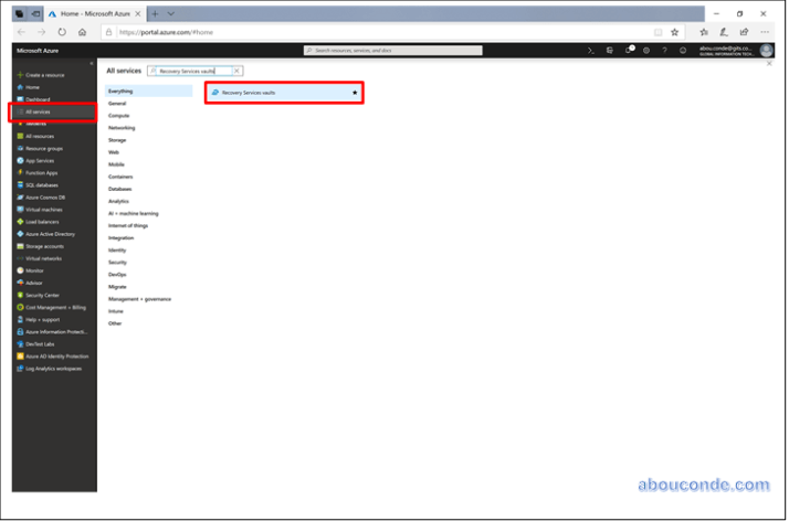 In the All services dialog box, enter Recovery Services. The list of resources filters according to your input. In the list of resources, select Recovery Services vaults.