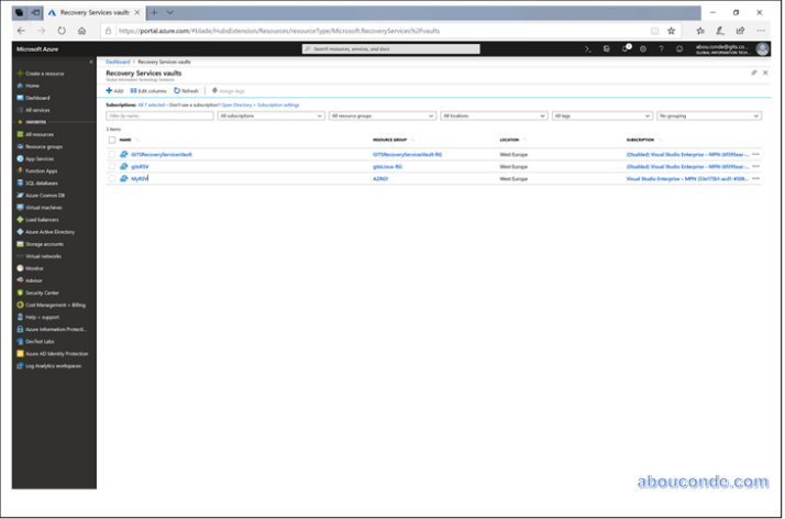It can take a while to create the Recovery Services vault. Monitor the status notifications in the Notifications area at the upper-right corner of the portal. After your vault is created, it’s visible in the list of Recovery Services vaults. If you don’t see your vault, select Refresh.