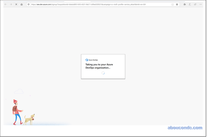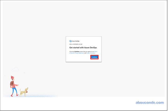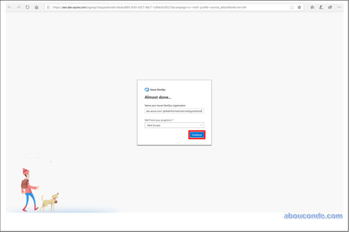 Enter a name for your organization. The name can’t contain spaces or special characters (such as / \ [ ] : | < > + = ; ? or *), can’t end in a period or comma, must be less than 256 characters, and must be unique within the DevOps namespace. You can also choose between several locations for where you want your data hosted. Select Continue.