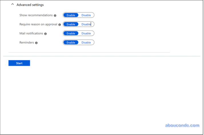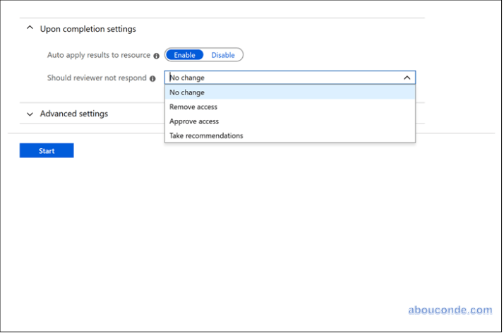 Set the Start date. By default, an access review occurs once, starts the same time it’s created, and it ends in one month. You can change the start and end dates to have an access review start in the future and last however many days you want.