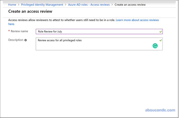 Name the access review. Optionally, give the review a description. The name and description are shown to the reviewers.