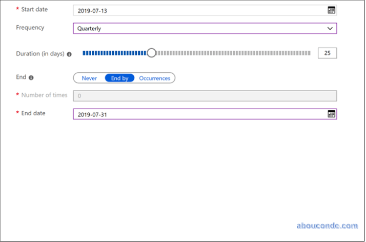 To make the access review recurring, change the Frequency setting from One time to Weekly, Monthly, Quarterly, Annually, or Semi-annually. Use the Duration slider or text box to define how many days each review of the recurring series will be open for input from reviewers. For example, the maximum duration that you can set for a monthly review is 27 days, to avoid overlapping reviews.