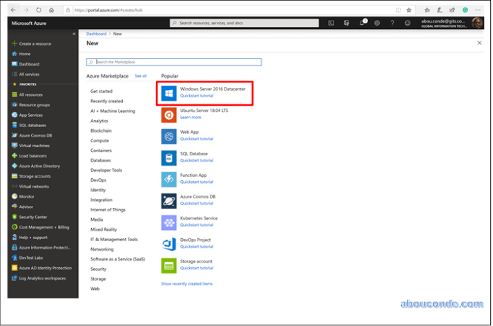 In the New page, under Popular, select Windows Server 2016 Datacenter.
