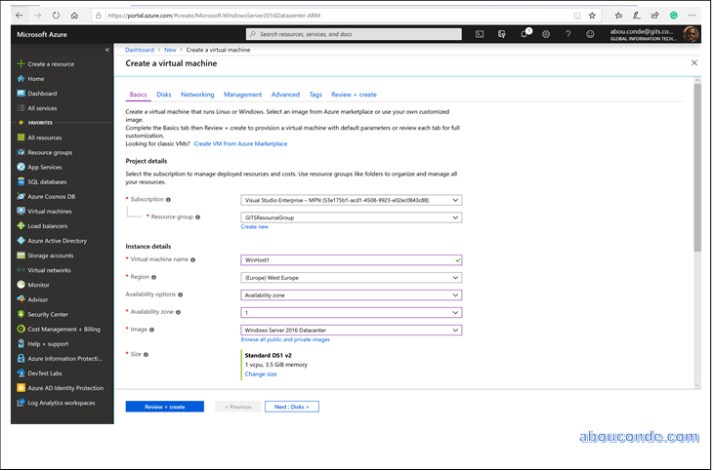 Under Instance details, type WinHost1 for the Virtual machine name and choose West Europe for your Location. Leave the other defaults.