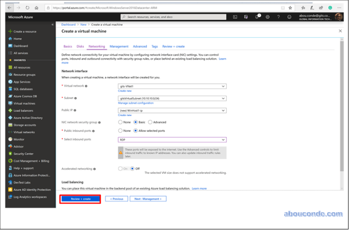 On Networking tab, Select Virtual Network gits-VNet1, Subnet and Public IP WinHost1-ip, then